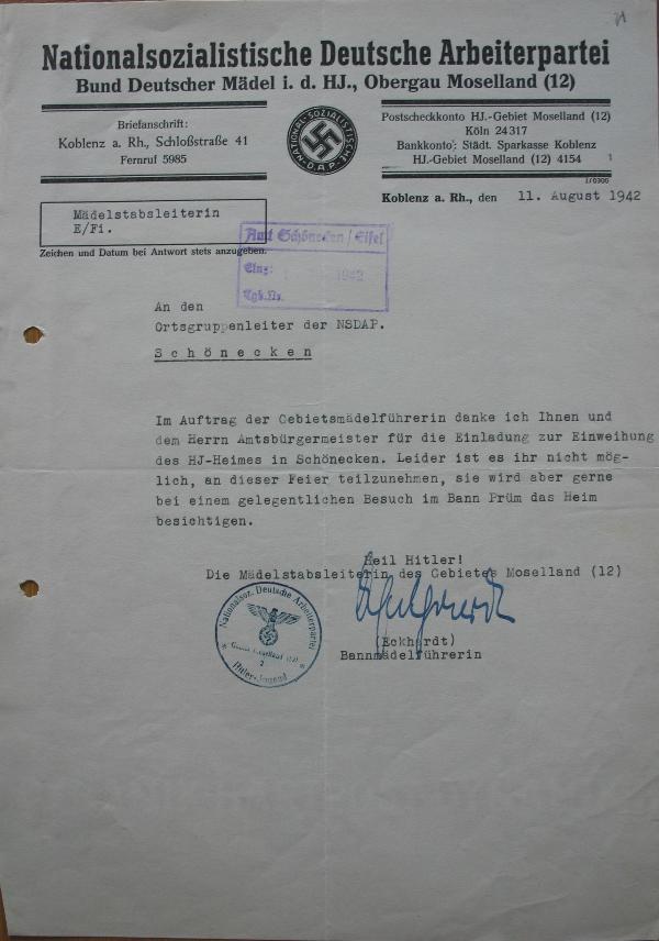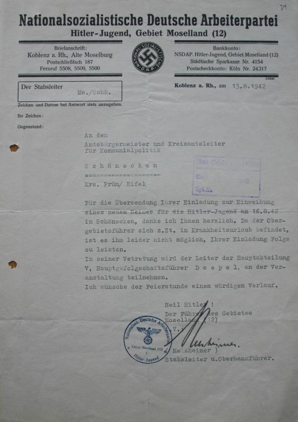 Dokumente: 2) Zusage der Teilnahme der HJ Obergau Moselland vom 13.08.1942, zur Einweihung des HJ-Heimes am 16.08.1942 in Schönecken. |