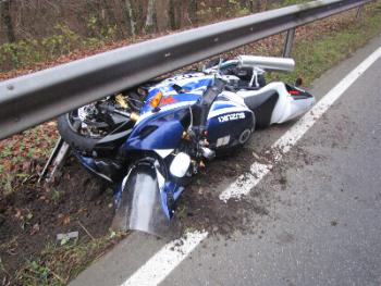 am Sonntag, den 08.11.2009, gegen 16.00 Uhr, auf der B 410, Gemarkung Büdesheim: Ein 42-jähriger Mann aus dem Altkreis Prüm befuhr mit seinem Krad die B 410 aus Richtung Gerolstein kommend in Fahrtrichtung Prüm. In einer lang gezogenen, ansteigenden Linkskurve verlor er vermutlich aufgrund nicht angepasster Geschwindigkeit die Kontrolle über sein Motorrad und kam nach links von der Fahrbahn ab. Der Fahrer rutschte dabei ca. 130 Metern über die Fahrbahn und prallte gegen die linke Schutzplanke,