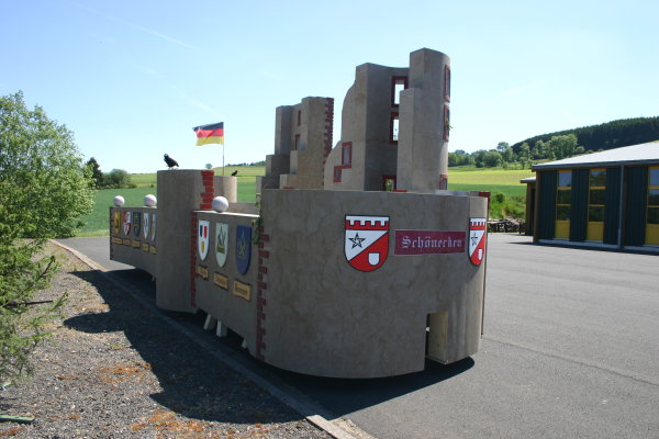reihten sich als Fußgruppen in den Zug ein. Die beiden Vereine hatten zuvor gemeinsam in wochenlanger Kleinarbeit die Burgruine maßstabs- und detailgetreu im Größenverhältnis 1:20 nachgebaut und auf einen Tieflader montiert. Ein beeindruckender Wagen, auf dem selbst die „Schönecker Krähen“ nicht vergessen wurden. Leider blieb die Burg auf dem Anhänger während des Umzugs unbesetzt, da das Gefährt sonst vom TÜV hätte geprüft werden müssen. Schade, dass wir diesen tollen Wagen nicht noch einmal an Karneval 2012 zu Gesicht bekommen! Wegen Platzmangels wird die Miniatur in Kürze wieder zerlegt. |
