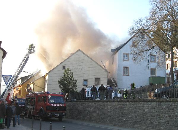 Foto oben: der verheerende Brand am 2. April 2013, die Löschwasserschäden waren noch größer als die Brandschäden. Bereits am 31.3.2013 gab es einen Elektrobrand in einem Kellerraum des Anwesens. |