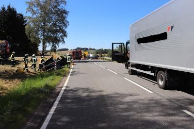 Prüm Am Freitag, den 10.07.2020, kam es gegen 18:30 Uhr auf der B 265 in Höhe des Hofguts "Held" zu einem schweren Verkehrsunfall zwischen einem Motorrad und einem PKW. Ein 29 jähriger PKW-Fahrer aus Nordrhein-Westfahlen befuhr die B265 aus Fahrtrichtung Rommersheim kommend in Fahrtrichtung Prüm. In Höhe des Hofguts "Held" wollte er nach links abbiegen. Ein 28 jähriger Motorradfahrer aus dem Eifelkreis Bitburg-Prüm befährt die B265 in gleicher Fahrtrichtung und fährt von hinten auf den verkehrsbedingt wartenden PKW auf. Infolge der Kollision wurde der Fahrer des Motorrads schwerverletzt und musste in ein Krankenhaus geflogen werden. Beide Fahrzeuge wurden erheblich beschädigt und waren nicht mehr fahrbereit. Der Gesamtschaden beläuft sich auf ca. 20000 EUR. Auf Anordnung der Staatsanwaltschaft Trier wurde ein Gutachter zur Unfallaufnahme hinzugezogen. Die Unfallstelle musste für mehrere Stunden gesperrt werden. Im Einsatz waren die Feuerwehr Rommersheim, ein Notarzt und der Rettungsdienst aus Prüm, ein Rettungshubschrauber, ein Abschleppfahrzeug sowie die Polizei Prüm. Zeugen des Verkehrsunfalls werden gebeten sich bei der Polizei in Prüm, 06551/9420, zu melden. |