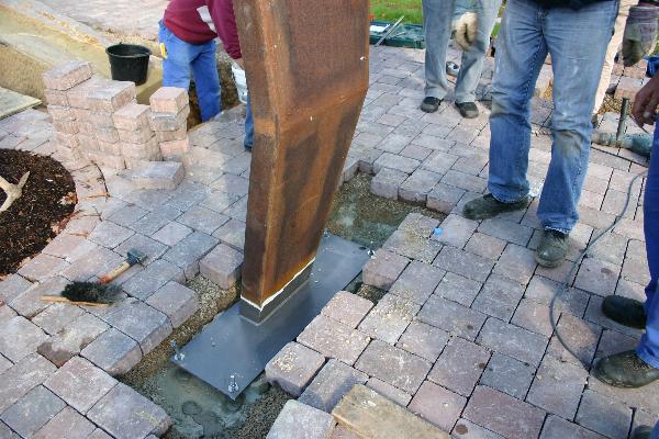 Die eingesetzten Gewindestäbe wurden mit Schnellzement vergossen, um dann nach etwa einer Stunde die Gewindemuttern anziehen zu können und dem Stahl damit seine endgültige Standfestigkeit zu verleihen.