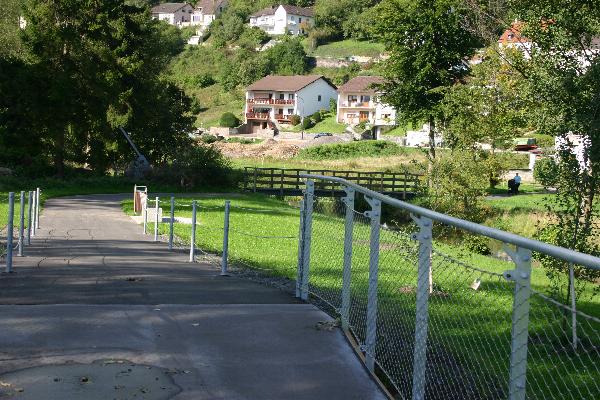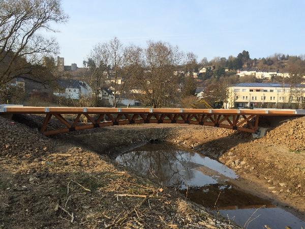 Hühnerbachbrücke zur Nimsfußgängerbrücke und zum Brühl. |