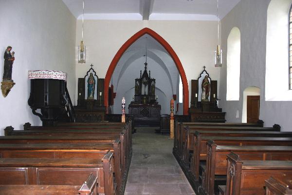 Der Innenraum ist ebenso schlicht wie das Äußere: Der Chor wird von einem Kreuzgratgewölbe auf Konsolen überdeckt, das Schiff besitzt eine einfache Voutendecke. Von der älteren Ausstattung sind die Westempore aus der Zeit der Kirchenverlängerung, die nachbarocke Kanzel und eine spätgotische Pietä erhalten, alles übrige ist neugotisch und stammt von einer Renovierung zwischen 1887 und 1891 (drei Altarretabel, Kommunionbank, Gestühl, Figuren).