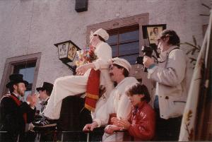 die Eierlage ausgerichtet haben. Von der Von-Hersel-Straße führt nach dem Wettkampf ein erneuter Umzug mit Musik ins Festzelt, wo die Eierlage weiter gefeiert wird. Bei der Tanzveranstaltung am Abend gebührt Raffer und Läufer alljährlich ein Ehrentanz. Nach der meist ausgiebigen Feier der Eierlage am Ostermontag findet der Osterbrauch im Kreise der Junggesellen am Osterdienstag ein Ende: Im Vereinslokal werden die von Raffer und Läufer gesammelten Eier - meist deutlich mehr als 104 - verspeist. |