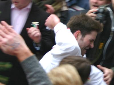 folgt die Siegerehrung, bei der die Junggesellen den Sieger der Eierlage hochleben lassen.