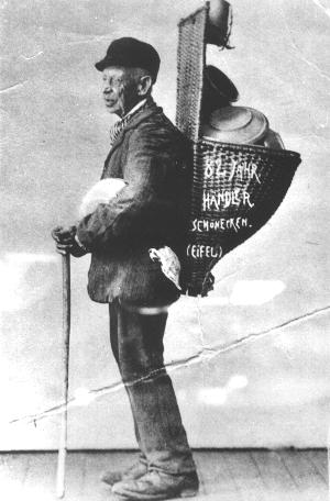 Er übte diesen Beruf mehr als 40 Jahre aus. Die Waren trug er, wie auf dem Bild rechts