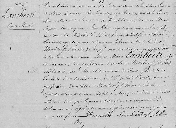 Im Jahr 1846, 22. Oktober, um 2 Uhr am Nachmittag, vor uns Jean Baptiste Joseph Avio, Sanitätshauptmann, Standesbeamter der Gemeinde Mers-el-Kébir, Arrandissement Oran, Algerien, sind erschienen: Johann Klein, 49 Jahre alt, Arbeiter, wohnhaft in Udenbreth, (Preußen), Nachbar der Verstorbenen, Henri Lamberti, 43 Jahre alt, Arbeiter, wohnhaft in Wetteldorf, (Preußen); welche uns erklärten, dass heute um 6 Uhr morgens, Anne Marie Lamberti, 5 Jahre alt, ohne Beruf, wohnhaft in Wetteldorf (Preußen), ledig, geboren in Baseld, preußisches Königreich, Tochter von Henri Lamberti, einer der Erklärenden/anzeigenden Personen, und von Elizabeth Schmitz, ohne Beruf, wohnhaft in Wetteldorf, (Preußen), im Depot/Lager der preußischen Ansiedler, errichtet in den Baracken der militärischen Verwaltung, in der Nähe der großen Batterie (Anmerkung: Artillerieeinheit) dieser Gemeinde verstorben ist. Und die Erklärenden haben mit uns die vorliegende von uns angefertigte Urkunde nach dem Lesen (dieser) unterzeichnet. Henrich Lamberti, J. Klein Avio |