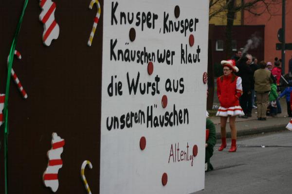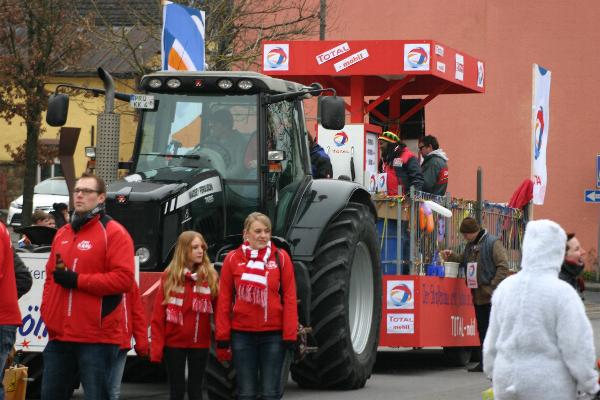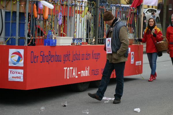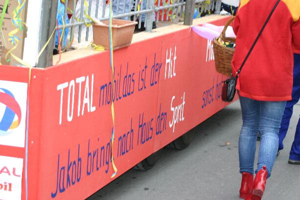 | Der Wagen des Handwerkervereins. Thema: Neubau der L5 in der Ortslage und die dadurch entstehenden Schwierigkeiten, die Tankstelle offen zu halten. | ||