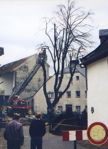 Darum blieb der Gemeinde keine andere Möglichkeit, als die Fällung zu beordern.Feuerwehr und Bauhof nahmen sich dieser nicht ganz einfachen Aufgabe unter