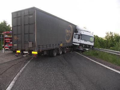 | Der Sattelzug schleuderte nach links über die Gegenfahrbahn, prallte