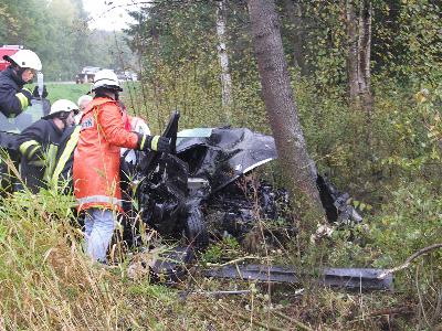mit einem Baum und prallte anschließend frontal gegen einen Holzschuppen. Der Fahrer