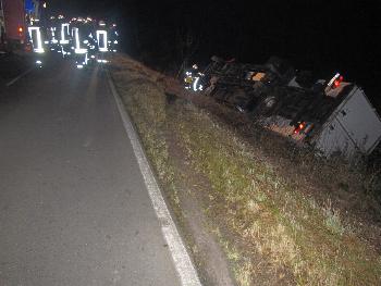 Böschung auf die Seite. Der Lkw war mit 4 Tonnen gefrorenem Fisch beladen und musste am