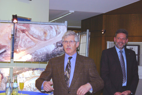 Luftbildern während der Vernissage am 18. März 2011- und Raiba Westeifel Vorstand Klaus Peters.