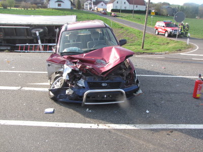 Leichtverletzten Ein folgenschwerer Verkehrsunfall ereignete sich am Freitag, dem 8. April, gegen 16.30 Uhr, auf der B 51 zwischen den Anschlußstellen Brühlborn und Olzheim, als in dem dort eingerichteten Baustellenbereich ein in Richtung Köln fahrender Pkw-Fahrer trotz Überholverbots auf dem beidseitig einspurigen Streckenabschnitt einen Lkw überholen wollte. Um einen Frontalzusammenstoß zu verhindern, wich ein entgegenkommender Geländewagen-Fahrer geistesgegenwärtig nach rechts aus und überfuhr eine Baustellen-Bake. Der nachfolgende Pkw konnte nicht mehr rechtzeitig ausweichen und prallte gegen das Heck des Geländewagen, wodurch sich an dem Pkw die konkrete Gefahr eines Motorbrandes entwickelte, welche durch sofortige Löschmaßnahmen eines Beteiligten glücklicher Weise frühzeitig gebannt werden konnte. Durch den Auffahrunfall wurden insgesamt 4 Fzg-Insassen in den zwei Fahrzeugen leicht verletzt. Sie konnten nach ambulanter Versorgung im Krankenhaus Prüm wieder entlassen werden. Es entstand Sachschaden von ca. 15.000 Euro. Im Einsatz waren die Polizei, Feuerwehr und das DRK Prüm. |
