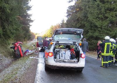 Person am Montag, den 17.02.2014, 09.00 Uhr, auf der L 5 bei Rommersheim: Eine 53-jährige PKW-Fahrerin aus dem Altkreis Bitburg befuhr die L 5 in Fahrtrichtung Schönecken. Vor der Ortslage Rommersheim, in einer Rechtskurve, kam sie auf nasser Fahrbahn ins Schleudern, und nach links von der Fahrbahn ab. Der PKW fuhr eine Böschung hinab und kam, auf dem Dach liegend, auf einem Wirtschaftsweg zum Stillstand. Da zunächst eine eingeklemmte Person gemeldet worden war, wurde die Feuerwehr Prüm alarmiert. Die Fahrerin konnte sich jedoch vor Eintreffen der Einsatzkräfte selbstständig aus dem Fzg. befreien. Durch das DRK Prüm wurde sie in ein Krankenhaus eingeliefert, konnte dieses aber nach ambulanter Behandlung verlassen. Es entstand ein Sachschaden in Höhe von ca. 8000 Euro. |