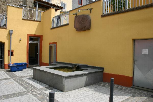 Der mit Basalt verkleidete Brunnen. Die Brunneneinsätze sind aus Edelstahl und wurden von Werner Batzdorfer unentgeltlich gefertigt und eingebaut. Nicht zu übersehen: Die Jakobsmuschel im oberen Bereich wurde vom Kulturkreis "Altes Amt" gestiftet. |