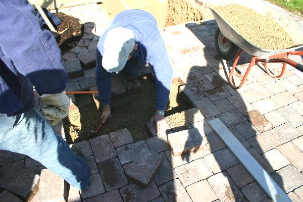 Das Pflaster oberhalb der Fundamente wird entnommen, um die Stahlskulpturen installieren zu können.