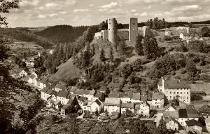 Note. Aber ein tragisches Geschick liegt über dieser Periode; die drei letzten Brüder Hartard, Gerhard und Johann starben alle ohne Manneserben. Und noch zu Lebzeiten des letzteren dieser Brüder Johann fallen schon die lachenden Erben über Schöneckens große Macht, und diese Zeit ist ein langsames aber stetes Hinuntergleiten von jener stolzen Höhe, die es unter Hartards ritterlichem Regiment innehatte. Nach Johanns Tode trat nun auch Elisabeth von Schönecken Gemahlin Gotthards von Wiltz mit ihren Ansprüchen an Schönecken auf. In den Unterhandlungen mit Burkhard schien keine Einigung zustande zu kommen. Jetzt trat Elisabeth in Verhandlungen mit Herzog Wenzeslaus von Luxemburg. Um diese Zeit starb nun Burkhard, in ihm der letzte selbständige Herrscher von Schönecken. Hartards Gemahlin Margareta von Falkenburg hatte drei Jahre nach Hartards Tod 1353 eine neue Ehe mit Burkhard von Vinstingen geschlossen und ihrem Gemahl Schönecken zugebracht. Burkhard war ein kühner und kampffroher Ritter und erscheint bald als selbständiger Führer eines eigenen Ritterfähnleins, 1356 trat er in die Dienste des Herzogs der Normandie. Er führte dem Herzog 500 Ritter zu; in Frankreich übernahm er den Befehl über einen französischen Heerhaufen und schlug die Engländer bei Noget sur Seine und zwang sie durch diesen Sieg die Champagne zu räumen. Da Herzog Karl zögerte, die 30000 Pfund, die er Burkhard als Sold schuldete, zu zahlen, kündigte dieser dem Herzog den Dienst auf. Mit seinem Heerhaufen überfiel er Bar sur Seine, plünderte Stadt und Umgebung solange, bis man ihn vollständig befriedigt hatte (Eifl. ill. III, 2, 1, 375). Hierauf erscheint Burkhard im Dienste der Stadt Metz, Quittungen über 9500 Gulden aus den Jahren 1365 und 1368 zeigen ihn als Führer eines Fähnleins (Reg.Publ. 24, 94, 110). Trotz dieser auswärtigen Kriegsdienste vernachlässigte er seine Schönecker Herrschaft keineswegs, sondern wusste geschickt alle Vorteile auszunützen. Auf Burg Schönecken setzte er einen Burgverwalter ein, so 1370 Friedrich von Jünkerath gegen eine Monatsrente von 100 Goldgulden (Reg.Publ. 24, 120). 1371 erhielt er von Wilhelm von Orley als Pfand für eine geliehene Geldsumme von 150 Talern Dorf und Wälder zur Wiltingen bei Saarburg (Reg.Publ. 24, 124). Im Jahre 1373 scheint Burkhard von Vinstingen gestorben zu sein, 1374 übertrug nämlich seine verwitwete Gemahlin ihre Rechte an Burkhards Bruder, Ullrich von Vinstingen (R.P. 24, 148). Damit ist Schöneckens selbständige Herrschaft vorbei. Am 4. Februar 1377 verkaufte Ullrich von Vinstingen und Burkhards Söhne, Burkhard und Johann, Herrschaft und Burg Schönecken mit Lehen und Afterlehen mit allem Zubehör, auch mit den Dörfern Schweich und Mehring sowie der Vogtei über die Abtei Prüm für 26000 Goldgulden an Herzog Wenzeslaus. Gleichzeitig verpflichteten sie ihre Untertanen, zukünftig Wenzeslaus Diensten zu stehen und entbanden sie von Gehorsam und Lehenspflicht (Eifl. ill. III, 2, 1, 367). Schon am folgenden Tag gab Ulrich von Vinstingen Quittung über die erhaltene Kaufsumme von 26000 Gld. Ganz ohne Schwierigkeiten ging die Herrschaft nicht an Wenzeslaus über. Simon, Graf von Vianden und Sponheim erhob gegen Wenzeslaus Ansprüche auf St. Vith, Bütgenbach, Lünebach und Pronsfeld, die zur Herrschaft Schönecken gehörten, einstmals jedoch Eigentum der Viandener waren, Einspruch. Im Oktober 1380 kam es zu einem Entscheid durch ein adliges Schiedsgericht zu dem Johann von Schleiden von Wenzeslaus als Vertreter entsandt worden war, da der Erzbischof persönliche Angelegenheiten in Brabant zu erledigen hatte (Reg.Publ. 24, 185). Gadard von Wiltz als Elisabeths Gemahl hatte nach Johanns Tode Burg Hartelstein erhalten, er und seine Nachkommen führten den Namen Schönecken und 1497 wird ein Johann von Schönecken als Herr von Hartelstein genannt (Reg.Publ. 31, 239). |