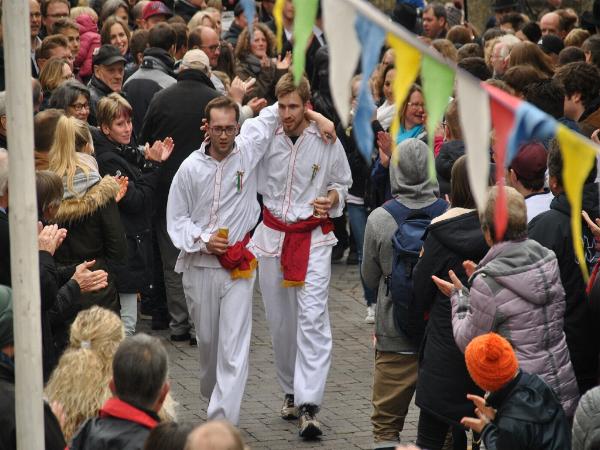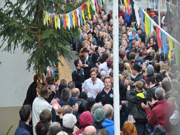 folgt die Siegerehrung, bei der die Junggesellen den Sieger der Eierlage hochleben lassen.