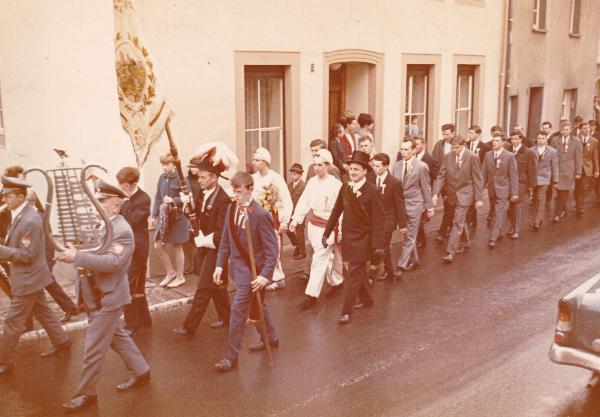 die Sodalität mit Raffer und Läufer vom Vereinslokal in die Kirche. Um die Mittagszeit