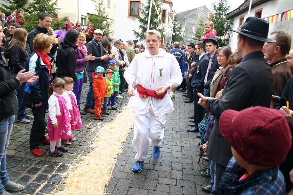 Vorbereitungen dazu beginnen in der Junggesellensodalität schon eine Woche vor Ostern. Am Sonntag vor Ostern, dem Palmsonntag, wird die Eierlage versteigert. Aus Reihen des Vereins melden sich Junggesellen, die den Brauch ausrichten wollen. Mit einem besonderen Versteigerungsmodus wird ein Paar auserkoren, das Raffer und Läufer stellt. Um die 104 Eier, die für den Wettbewerb gebraucht werden, müssen sich die beiden anschließend selbst kümmern. Am Ostersamstag gehen sie deshalb durch den ganzen Flecken, stellen sich den Schöneckern vor und sammeln die Eier. Der Rest der Junggesellen bereitet derweil die Von-Hersel-Straße, in der die Eierlage veranstaltet wird, auf den großen Tag vor: Mit einem meist feucht-fröhlichen Ausflug geht es in den Schönecker Gemeindewald, wo Bäume geschlagen werden, die in der Von-Hersel-Straße die Eierlaufstrecke säumen. Der Festtag, Ostermontag, beginnt morgens mit dem Besuch des Hochamtes. Angeführt vom Musikverein und begleitet vom Sankt-Josef-Handwerkerverein zieht die Sodalität mit Raffer und Läufer vom Vereinslokal in die Kirche. Um die Mittagszeit beginnen in der Von-Hersel-Straße die letzten Vorbereitungen für die Eierlage. Unter Aufsicht von Hauptmann und Brudermeister werden 104 rohe Eier im Abstand einer Elle, das sind 62,5 Zentimeter, im Sägemehl ausgelegt. Vor dem eigentlichen Wettkampf zieht die Sodalität noch einmal mit Musikbegleitung durch den alten Ortskern. Der Wettkampf beginnt mit Handschlag und Bruderkuss, den Zeichen für Fairness und Gemeinschaft. Der Raffer muß die 104 Eier einzeln aufraffen, sein längster Weg beträgt rund 65 Meter. Insgesamt legt er 6,9 Kilometer zurück. Dazu kommen 104 mal Bücken, Aufraffen, Drehen, Weiterlaufen und Ablegen der Eier im Sammelkorb. Der Läufer macht sich auf den Weg in den Nachbarort Seiwerath und zurück. Er hat rund 7,6 Kilometer zurückzulegen und muss dabei einen Höhenunterschied von 122 Metern bewältigen. In Seiwerath wird ihm seine Anwesenheit mit einer kurzen Notiz bestätigt. Dann läuft er zurück in Richtung Schönecken. Die Junggesellen halten in dieser Zeit dem Raffer eine Gasse frei, damit er die Eier aufraffen kann. Ein Sprecher unterrichtet die Zuschauer über die Zahl der verbleibenden aufzuraffenden Eier und über die Position des Läufers. Wenn der Läufer den Kemel passiert hat, die erste Stelle des Rückwegs, auf der er von Schönecken aus wieder zu sehen ist, verkündet ein Böllerschuss das Herannahen des Wettkämpfers. Je mehr das Rennen dem Ende zugeht, desto mehr steigt die Spannung. Aufgeregt feuern die Zuschauer entweder in der Von-Hersel-Straße den Raffer oder entlang des Wegs nach Seiwerath den Läufer an. Wer von den beiden zuerst seine Aufgabe erledigt hat, ist Sieger der Eierlage. Für den Läufer heißt das, er muss aus Seiwerath früher am Sammelkorb ankommen, als sein Gegner die 104 Eier aufgerafft hat. Der Raffer dagegen hat gewonnen, wenn er die 104 Eier aufgesammelt hat, ehe der Läufer zurück ist. Das letzte Ei muss er dabei nicht bis zum Korb bringen, sondern kann es einfach in die Luft werfen. Für die meisten Junggesellen zählt aber nicht so sehr der Sieg, wie die Tatsache, überhaupt einmal an der Eierlage aktiv teilgenommen zu haben. |
