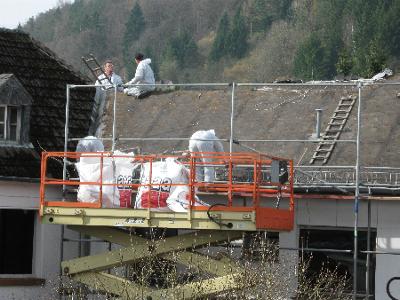 Arbeiter der Fa. Knaf beim abtragen des astbestbelasteten Schiefers.