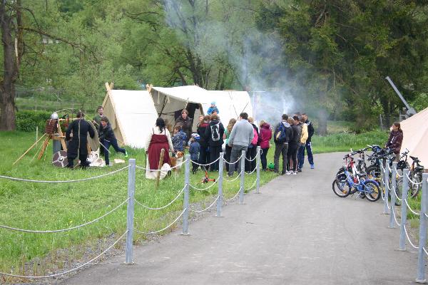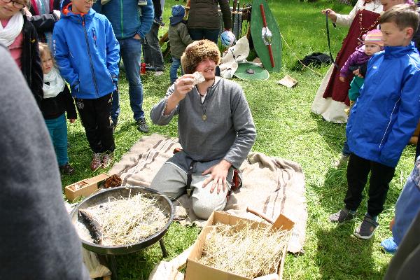 | Wo die Hühnerbach in die Nims mündet, hatte die mittelalterliche "Meute der Morrigan“ ihr Lager über Pfingsten aufgeschlagen. Für die Besucher inszenierte die Gruppe kleine Vorführungen über altertümliches Handwerk, Bogenschießen sowie Kräuter- und Waffenkunde. Foto unten: Landmann beim Feuer anzünden. | ||