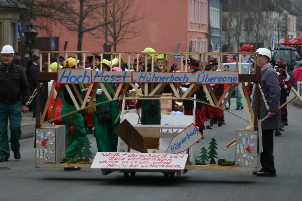 | Der Wagen des Handwerkervereins. Thema: Neubau der L5 in der Ortslage und die dadurch entstehenden Schwierigkeiten, die Tankstelle offen zu halten. | ||